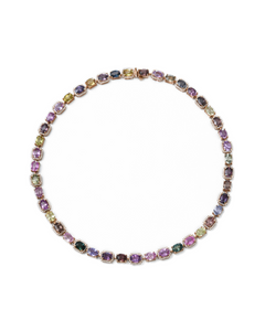 Custom made by The Portal Maui this stunning pieces features 34 carats prong set blue, pink, green, yellow and purple sapphires, set with 5 carats diamonds in 18 karat gold.
